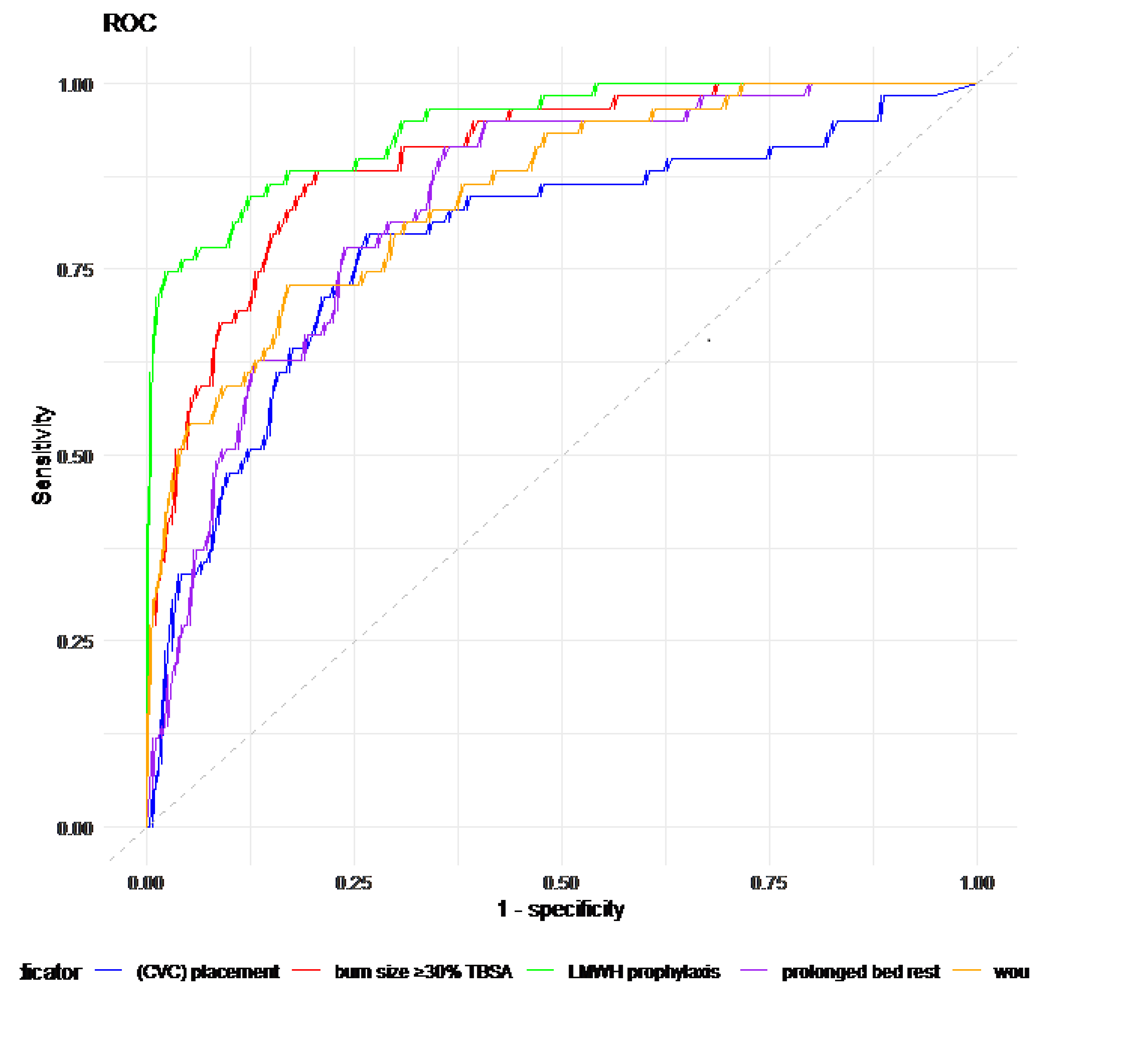 Figure1. ROC Curve. The integrative model synthesizing burn surface area, infectious wound status, prolonged immobilization period, and central venous catheter utilization exhibited significantly enhanced predictive accuracy relative to univariate analytical approaches.