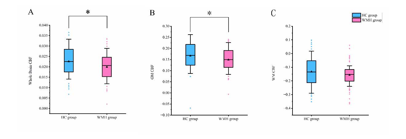 InformationFigure 1. Group comparisons of Whole brain CBF (A), GM CBF(B), WM CBF(C). Abbreviations: HC: healthy control; WMH: white matter hyperintensity; CBF: Cerebral Blood Flow; GM: Gray Matter; WM: White Matter; *: p < 0.05.