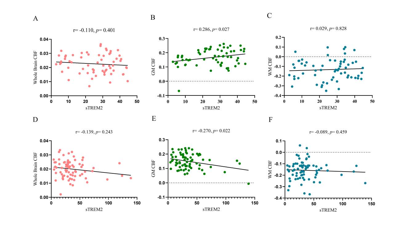 Results:Compared to HC group, serum sTREM2 levels were significantly elevated in the WMH group (P = 0.036), and gray matter(GM) CBF was significantly lower (P = 0.038). Logistic regression identified sTREM2 (OR = 1.041, P = 0.006) and age (OR = 1.081, P = 0.018) as independent risk factors for WMHs. Partial correlation analyses revealed a positive association between sTREM2 and gray matter CBF in healthy controls, but a negative association in the WMH group. Additionally, GM CBF was positively correlated with global cognitive scores (MMSE, MoCA) and executive function (Stroop Test C) in the WMH group.