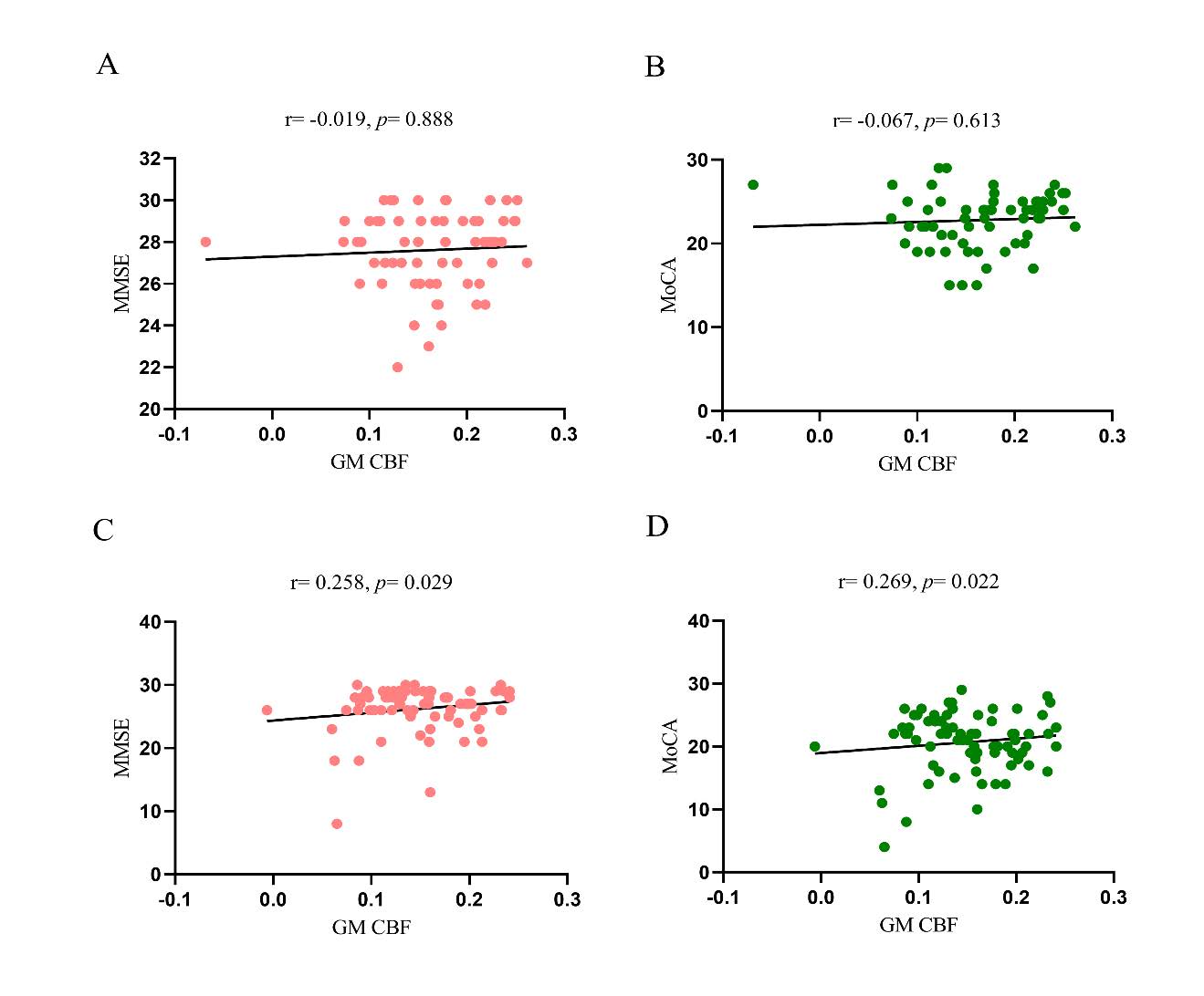 Significant differences are indicated in bold. Abbreviations: MMSE: Mini-Mental State Examination; MoCA: Montreal Cognitive Assessment; AVLT: Auditory Verbal Learning Test; SCWT: Stroop Color Word Test; TMT: Trail Making Test; DST-F: Digit Span Forward Test; DST-B: Digit Span Backward Test; HC: healthy control; WMH: white matter hyperintensity; CBF: Cerebral Blood Flow; GM: Gray Matter.