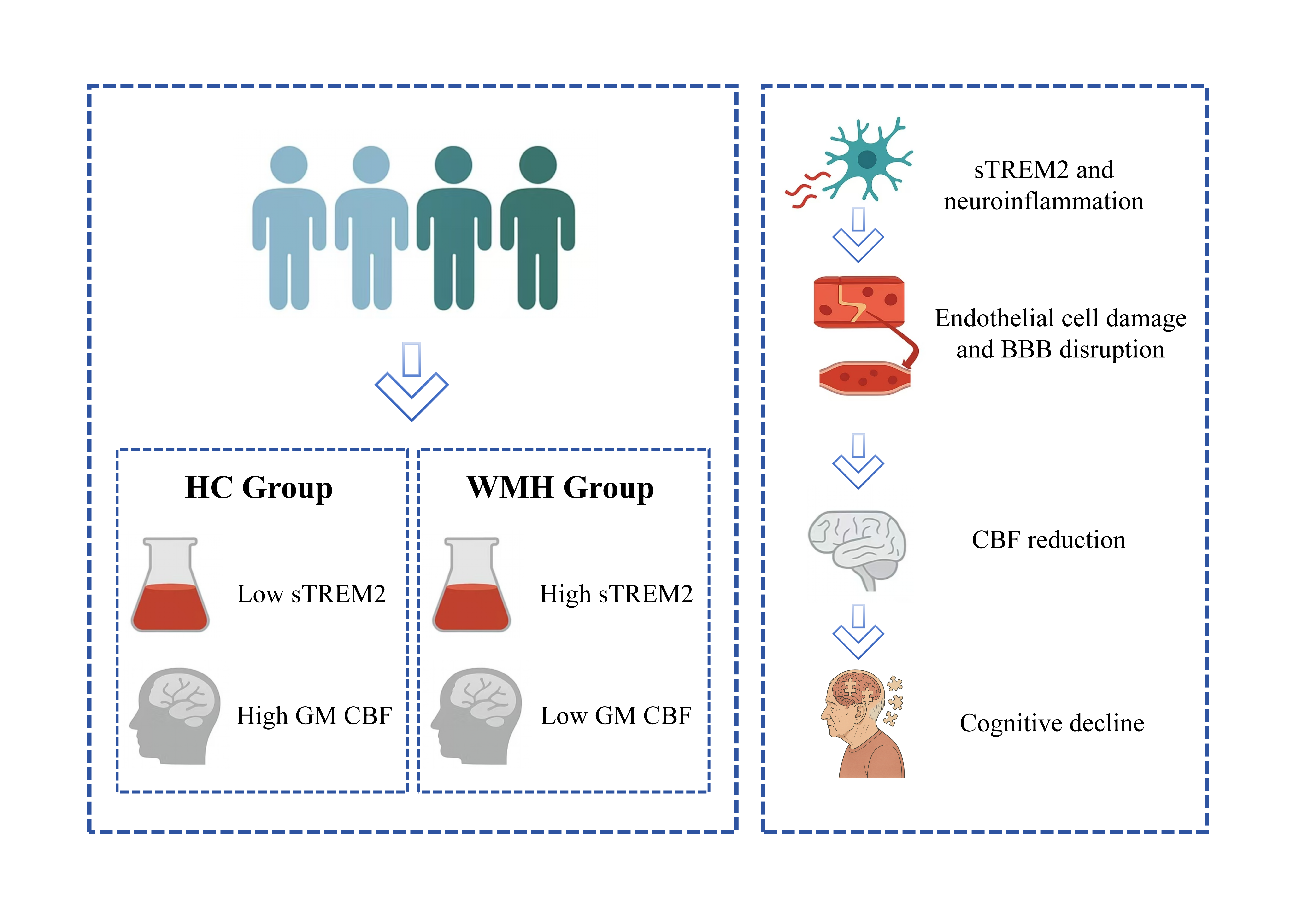 This study delineates a potential pathogenic pathway linking sTREM2, inflammation, and cerebral perfusion abnormalities to the development of WMH and cognitive impairment. Our findings suggest that inflammation-induced BBB disruption and CBF reduction may jointly contribute to white matter damage and subsequent cognitive decline. This mechanistic insight offers theoretical support for understanding WMH pathophysiology and highlights potential biomarkers and intervention targets for individualized clinical strategies.