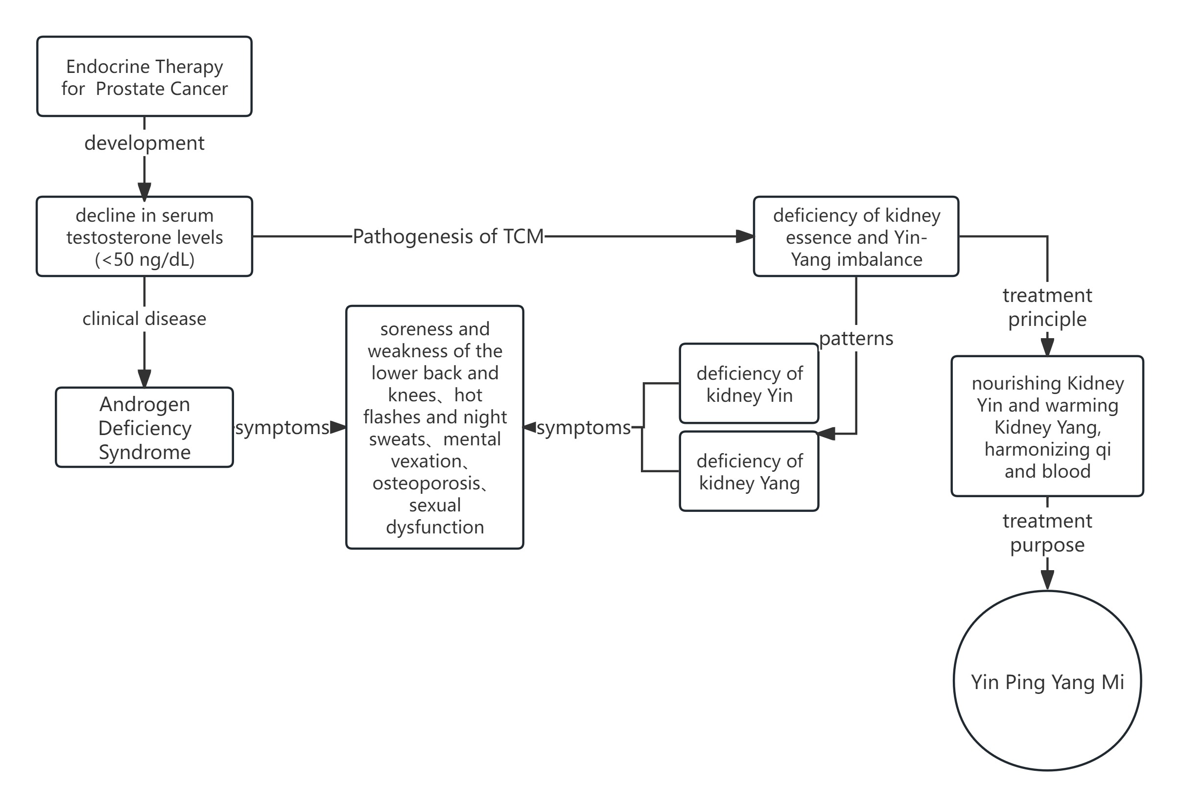 Purpose :To investigate the guiding value of the Traditional Chinese Medicine(TCM) “Yin Ping Yang Mi” theory in addressing androgen deficiency syndrome (ADS) following prostate cancer endocrine therapy, elucidate its pathological mechanisms and therapeutic strategies, and provide theoretical foundations for integrated Chinese-Western medical interventions.