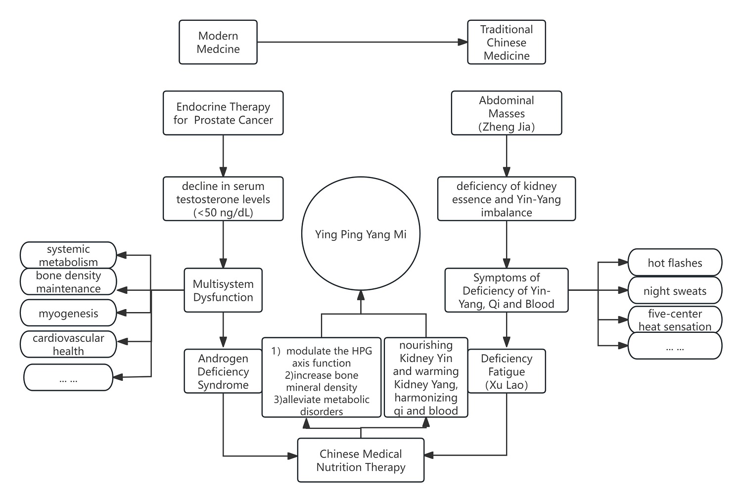 Figure 2. Proposed mechanisms linking Yin-Ping Yang-Mi to Androgen Deficiency Syndrome (ADS) from modern medical and Traditional Chinese Medicine (TCM) perspectives.Left panel (Modern Medicine): Illustrates the pathway from endocrine therapy for prostate cancer leading to declined serum testosterone levels (<50 ng/dL), which contributes to multisystem dysfunction affecting bone density, metabolic homeostasis, myogenesis, and cardiovascular health, ultimately resulting in ADS. Potential interventions include strategies to (1)modulate the HPG axis function, (2) increase bone mineral density, and (3) alleviate metabolic disorders.Right panel (Traditional Chinese Medicine): Demonstrates the TCM pathogenesis involving deficiency of kidney essence and Yin-Yang imbalance, manifesting as clinical symptoms including Deficiency Fatigue (Xu Lao), hot flashes, night sweats, and five-center heat sensation. Therapeutic approaches focus on nourishing Kidney Yin, warming Kidney Yang, and harmonizing Qi and blood through Chinese Medical Nutrition Therapy.